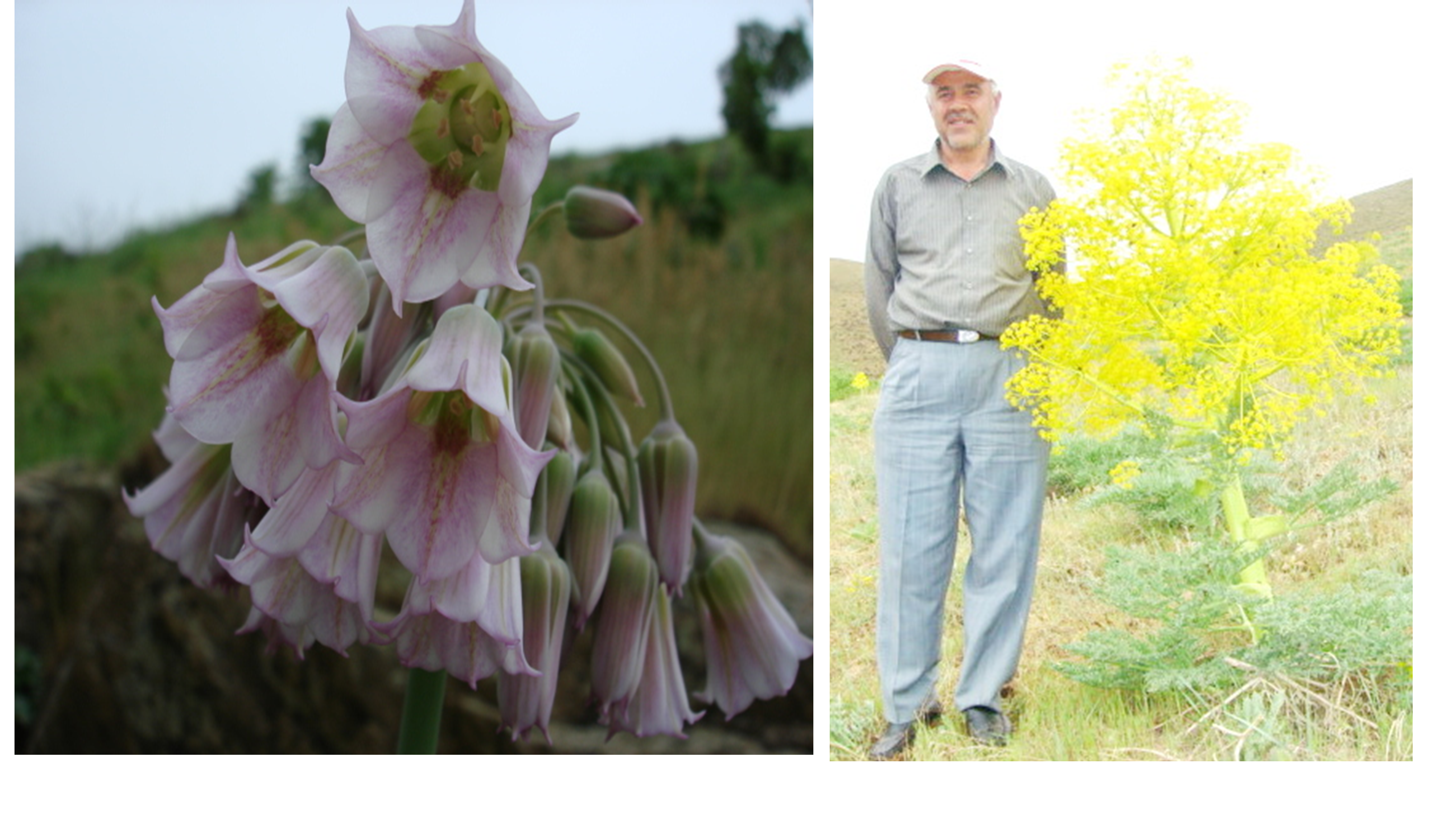 (عکس سمت راست: آقای مهندس حسین معروفی، یکی از دانشمندان برجسته گیاهشناسی کشور و هیئت علمی بازنشسته مرکز تحقیقات و آموزش کشاورزی و منابع طبیعی استان کردستان در کنار گونه Ferula pseudalliacea Rech.f.، عکس سمت چپ: گونه Allium tripedale Trautv.)