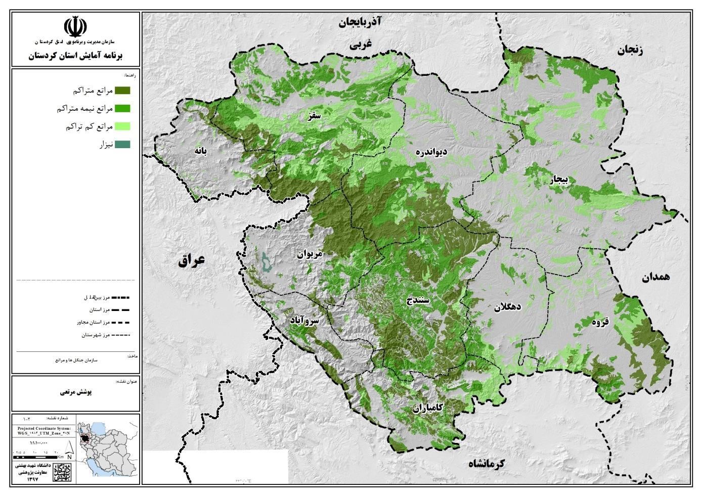پوشش مرتعی اغلب در شمال، شمال شرقی و جنوب استان کردستان رویش دارد. مراتع متراکم، نیمهمتراکم و تنک بهترتیب با تولید 750، 450 و 250 کیلوگرم علوفه قابلبرداشت در هکتار حدود 34، 38 و 28 درصد از سطح مراتع این استان را بهخود اختصاص دادهاند. ظرفیت مراتع استان در وضعیت موجود حدود دو میلیون واحد دامی برای یک دوره بهرهبرداری سهماهه است، درحالیکه تعداد دامهای روستایی و عشایری که از مراتع استان استفاده میکنند، بیشتر از سه میلیون و چهارصد هزار واحد برآورد میشود. این میزان، 7/1 برابر ظرفیت مراتع استان است. درمجموع، 42 تیپ مرتعی در استان کردستان شناسایی شده است که بیشتر آنها از جنسهای گون (Astragalus spp.) و چوبک (Acanthophyllum spp.) هستند. همچنین، مراتعی با خصوصیات منحصربهفرد در استان حضور دارند که میتوانند بهعنوان آشیانهای بومشناختی و یک منبع باارزش ذخیره ژنتیکی مورد توجه قرار گیرند.