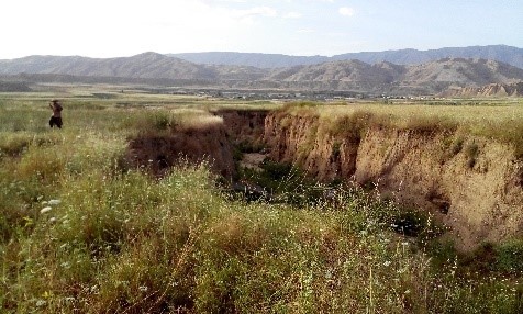 فرسایش خاک بهعنوان رایجترین فرآیند تخریب اراضی در استان کردستان شناخته میشود. چرای بیرویه و تغییر کاربری اراضی از طریق توسعه کشاورزی و باغداری از عوامل اصلی افزایش نرخ فرسایش خاک هستند. اداره ما روی فرسایش خندقی در شرق استان کردستان کار کرده است. خندقها کانالهای عمیقی هستند که در اثر غلظت آب جاری و حذف خاکهای مرتفع فرسایش می یابند که اغلب در خاکهای فرسوده، سنگبستر نسبت ضعیف یا رسوبات شیب تحکیم نشده رخ میدهند. در واقع فرسایش خندقی بهعنوان مخربترین فرآیند تخریب زمین شناخته شده است که رسوبدهی را به شدت افزایش میدهد. از آنجایی که فرآیندهای فرسایش خندقی با مدیریت ژئومحیطی ارتباط تنگاتنگی دارند، SCWMRD تلاش میکند تا مداخلات منفی انسانی را شناسایی کند و روشهای مناسب کاربری و مدیریت زمین را پیشنهاد کند که میتواند برای حفاظت و احیای خاک حیاتی باشد. عکس میدانی زیر گواه فرسایش شدید خندقی در استان کردستان است: